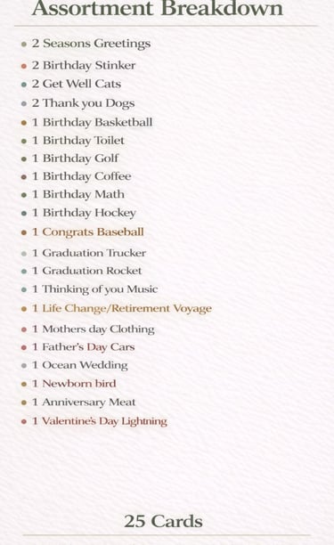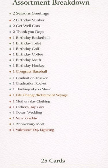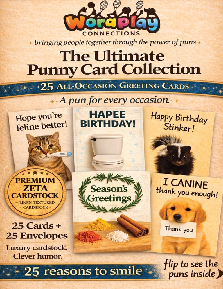 Take a look below to explore the cards included in the box — each one printed on premium linen-textured cardstock and filled with clever wordplay and thoughtful messages.