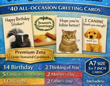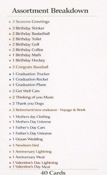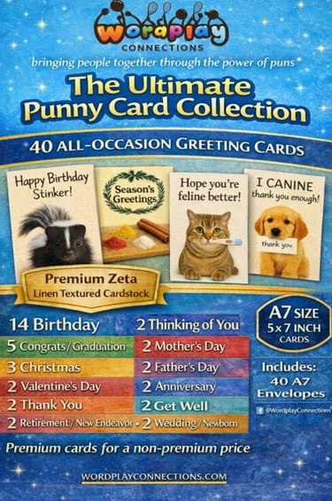 Take a look below to explore the cards included in the box — each one printed on premium linen-textured cardstock and filled with clever wordplay and thoughtful messages.
